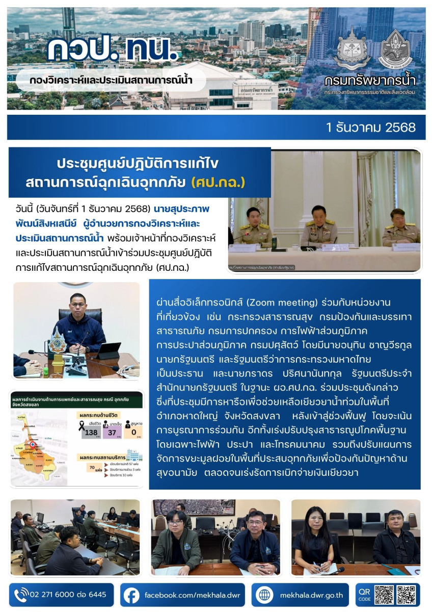 วันที่ 21 พฤศจิกายน 2568 นายสุประภาพ พัฒน์สิงหเสนีย์ ผู้อำนวยการกองวิเคราะห์และประเมินสถานการณ์น้ำ พร้อมด้วย นายยิ่งยง ลิคะสิริ ผู้อำนวยการส่วนประสานการปฏิบัติงานในภาวะน้ำท่วม เข้าร่วมประชุมคณะอนุกรรมการช่วยเหลือผู้ประสบสาธารณภัย...