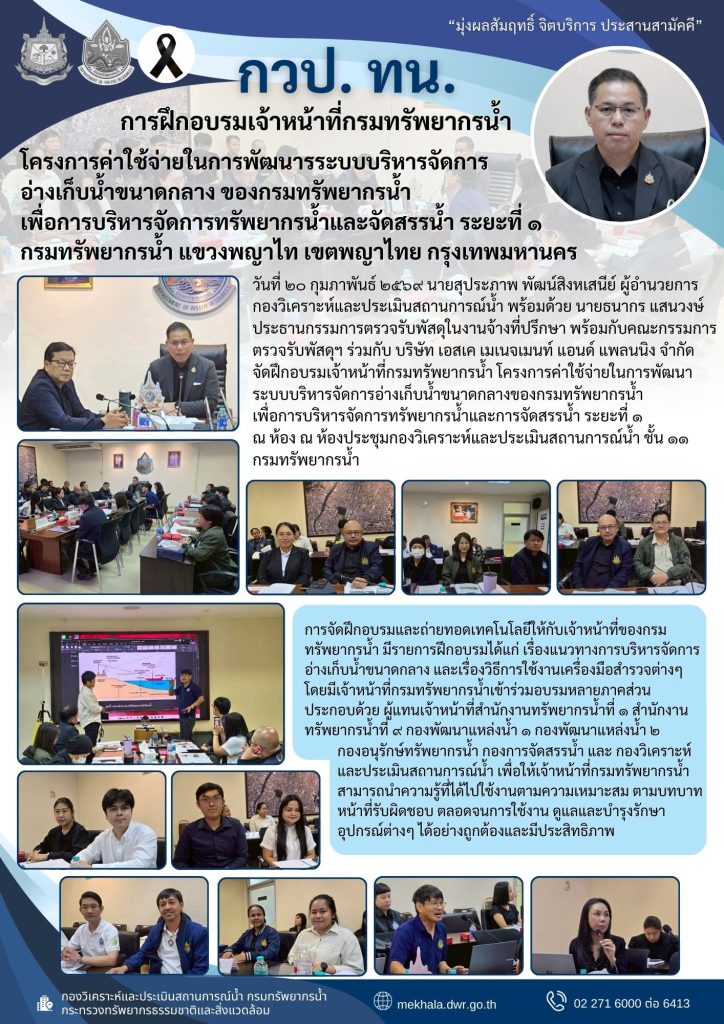 วันที่ 20 กุมภาพันธ์ 2569 นายสุประภาพ พัฒน์สิงหเสนีย์ ผู้อำนวยการกองวิเคราะห์และประเมินสถานการณ์น้ำ พร้อมด้วย นายธนากร แสนวงษ์ ประธานกรรมการตรวจรับพัสดุในงานจ้างที่ปรึกษา พร้อมกับคณะกรรมการตรวจรับพัสดุฯ ร่วมกับ บริษัท เอสเค แมเนจเมนท์ แอนด์ แพลนนิง จำกัด จัดฝึกอบรมเจ้าหน้าที่กรมทรัพยากรน้ำ โครงการค่าใช้จ่ายในการพัฒนาระบบบริหารจัดการอ่างเก็บน้ำขนาดกลางของกรมทรัพยากรน้ำ เพื่อการบริหารจัดการทรัพยากรน้ำและการจัดสรรน้ำ ระยะที่ 1 ณ ห้อง ณ ห้องประชุมกองวิเคราะห์และประเมินสถานการณ์น้ำ ชั้น 11 กรมทรัพยากรน้ำ