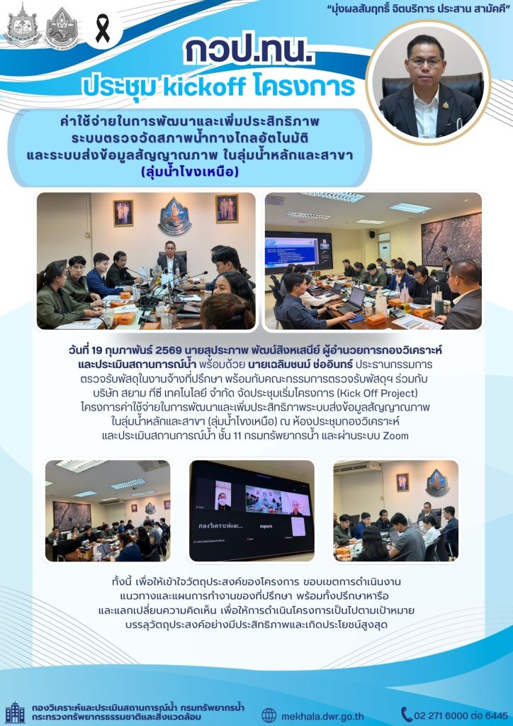 วันที่ 19 กุมภาพันธ์ 2569 นายสุประภาพ พัฒน์สิงหเสนีย์ ผู้อำนวยการกองวิเคราะห์และประเมินสถานการณ์น้ำ พร้อมด้วย นายเฉลิมชนม์ ช่ออินทร์ ประธานกรรมการตรวจรับพัสดุในงานจ้างที่ปรึกษา พร้อมกับคณะกรรมการตรวจรับพัสดุฯ ร่วมกับ