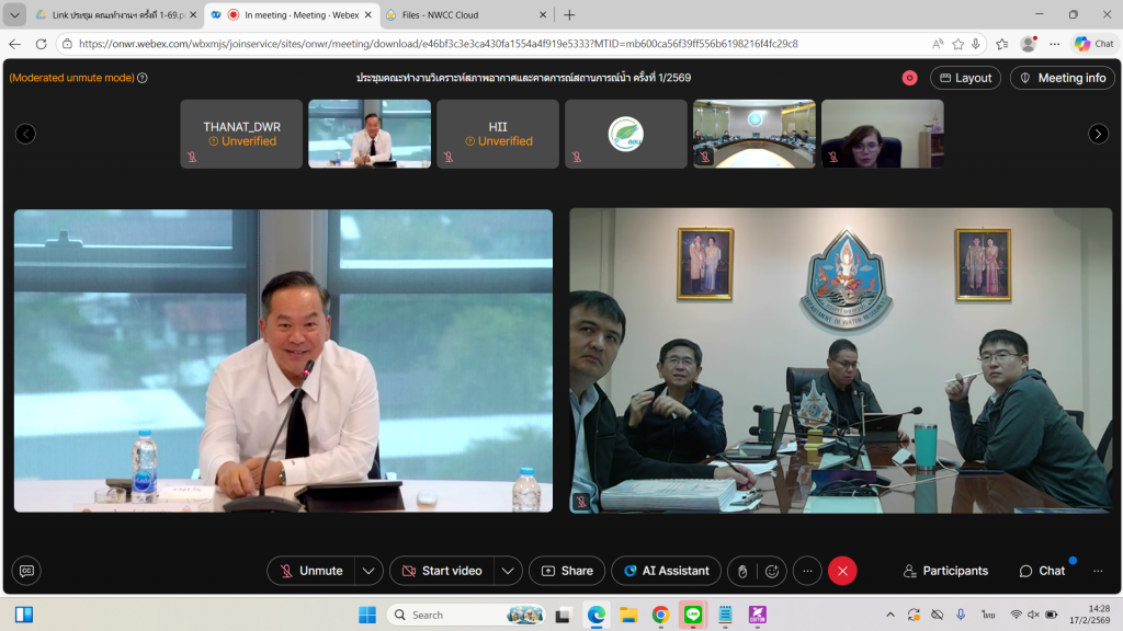 วันที่ 17 กุมภาพันธ์ 2569 นายธีระชุณ บุญสิทธิ์ อธิบดีกรมทรัพยากรน้ำ มอบหมายให้ นายสุประภาพ พัฒน์สิงหเสนีย์ ผู้อำนวยการกองวิเคราะห์และประเมินสถานการณ์น้ำ เข้าร่วมประชุมคณะทำงานวิเคราะห์สภาพอากาศและคาดการณ์สถานการณ์น้ำ ครั้งที่ 1/2569 ผ่านสื่ออิเล็กทรอนิกส์ ร่วมกับกรมอุตุนิยมวิทยา สถาบันสารสนเทศทรัพยากรน้ำ (องค์การมหาชน) กรมชลประทาน เป็นต้น เพื่อประเมินสภาพอากาศและคาดการณ์สถานการณ์น้ำให้เป็นไปในทิศทางเดียวกัน สอดคล้องกับสถานการณ์ และสามารถใช้เป็นข้อมูลประกอบการตัดสินใจเชิงนโยบายและเชิงปฏิบัติได้อย่างมีประสิทธิภาพ โดยมีนายไพฑูรย์ เก่งการช่าง รองเลขาธิการ ด้านบริหารจัดการน้ำ สำนักงานทรัพยากรน้ำแห่งชาติ เป็นประธานในการประชุม