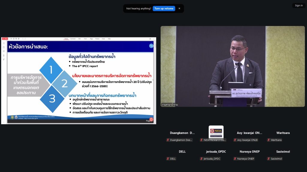 เมื่อวันที่ 13 มกราคม 2569 กรมทรัพยากรน้ำโดยนายสุประภาพ พัฒน์สิงหเสนีย์ ผู้อำนวยการ กองวิเคราะห์และประเมินสถานการณ์น้ำ ได้เข้าร่วมการประชุมเสวนาวิชาการ เพื่อแลกเปลี่ยนองค์ความรู้ มุมมองเชิงนโยบาย และแนวทางการบริหารจัดการปัญหาน้ำท่วมของประเทศไทยอย่างรอบด้าน ณ สถาบันบัณฑิตพัฒนบริหารศาสตร์ (NIDA) ในหัวข้อ “ ความท้าทายและโอกาสในการบริหารจัดการปัญหาน้ำท่วมของประเทศไทย” นอกจากนี้ในการเสวนาครั้งนี้ยังได้รับเกียรติจาก ดร.วิจารย์ สิมาฉายา ผู้อำนวยการสถาบันสิ่งแวดล้อมไทย กรมป้องกันและบรรเทาสาธารณภัย และศูนย์วิจัยต่างๆ เข้าร่วมเพื่อแลกเปลี่ยนมุมมองทั้ง 4 มิติ จาก 4 ศูนย์วิจัย ประกอบด้วย มิติที่ 1 : ระบบและโครงสร้างการบริหารจัดการน้ำท่วม (ศูนย์วิจัยสิ่งแวดล้อมและการเปลี่ยน แปลงสภาพภูมิอากาศ) มิติที่ 2 : การกระจายอำนาจบริหารภัยพิบัติและข้อสังเกตความเหลื่อมล้ำ (ศูนย์วิจัยการเติบโตทางเศรษฐกิจและความเหลื่อมล้ำในสังคม) มิติที่ 3 : การบริหารจัดการน้ำท่วมสำหรับกลุ่มเปราะบาง (ศูนย์วิจัยสังคมสูงอายุ) และมิติที่ 4 : โอกาสและความเป็นไปได้ในการแก้ปัญหาน้ำท่วมซ้ำซากของประเทศไทย (ศูนย์วิจัยประชาคมเศรษฐกิจอาเซียน)