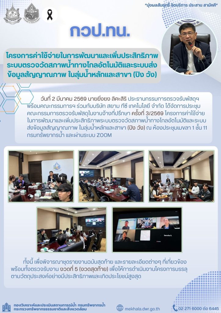 วันที่ 2 มีนาคม 2569 นายยิ่งยง ลิคะสิริ ประธานกรรมการตรวจรับพัสดุฯ พร้อมคณะกรรมการฯ ร่วมกับบริษัท สยาม ทีซี เทคโนโลยี จำกัด ได้จัดการประชุม คณะกรรมการตรวจรับพัสดุในงานจ้างที่ปรึกษา ครั้งที่ 3/2569โครงการค่าใช้จ่ายในการพัฒนาและเพิ่มประสิทธิภาพระบบตรวจวัดสภาพน้ำทางไกลอัตโนมัติและระบบส่งข้อมูลสัญญาณภาพ ในลุ่มน้ำหลักและสาขา (ปิง วัง) ณ ห้องประชุมเมขลา 1 ชั้น 11 กรมทรัพยากรน้ำ และผ่านระบบ ZOOM ทั้งนี้ เพื่อพิจารณาชุดรายงานฉบับสุดท้าย และรายละเอียดต่างๆ ที่เกี่ยวข้อง พร้อมทั้งตรวจรับงาน งวดที่ 5 (งวดสุดท้าย)เพื่อให้การดำเนินงานโครงการบรรลุตามวัตถุประสงค์อย่างมีประสิทธิภาพและเกิดประโยชน์สูงสุด