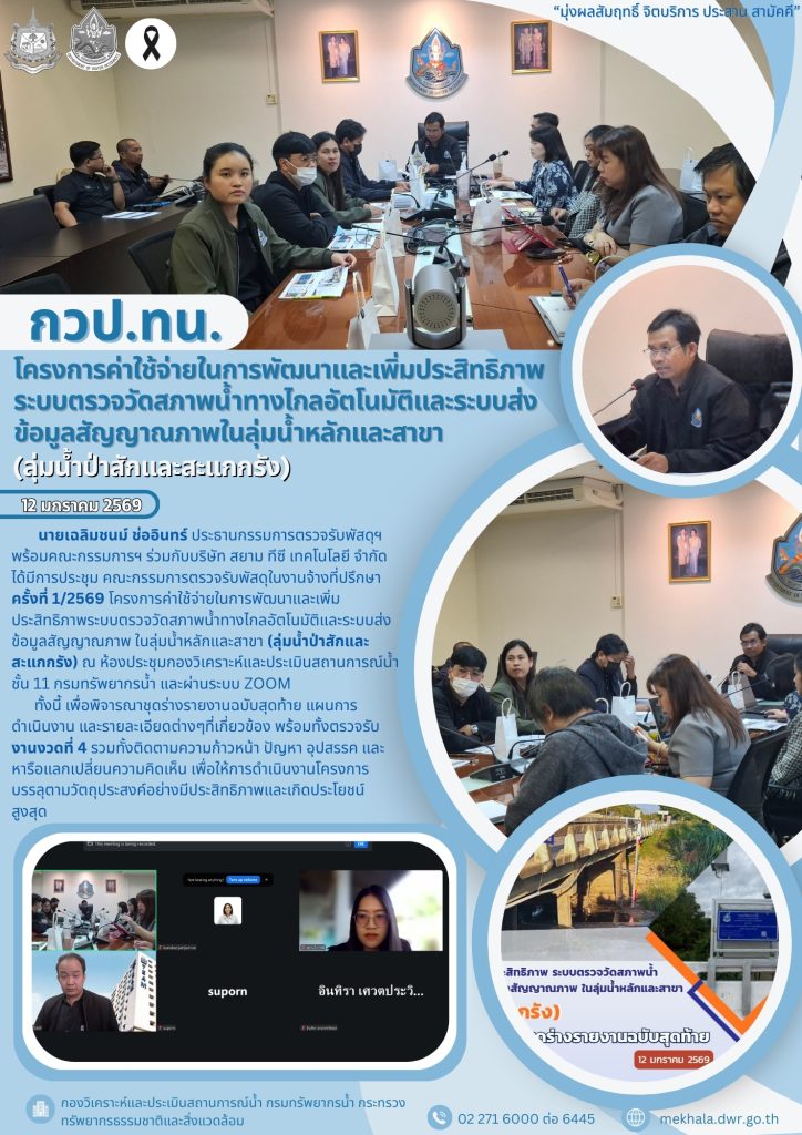 วันที่ 12 มกราคม 2569 นายเฉลิมชนม์ ช่ออินทร์ ประธานกรรมการตรวจรับพัสดุฯ พร้อมคณะกรรมการฯ ร่วมกับบริษัท สยาม ทีซี เทคโนโลยี จำกัด ได้มีการประชุม คณะกรรมการตรวจรับพัสดุในงานจ้างที่ปรึกษา ครั้งที่ 1/2569 โครงการค่าใช้จ่ายในการพัฒนาและเพิ่มประสิทธิภาพระบบตรวจวัดสภาพน้ำทางไกลอัตโนมัติและระบบส่งข้อมูลสัญญาณภาพ ในลุ่มน้ำหลักและสาขา (ลุ่มน้ำป่าสักและสะแกกรัง) ณ ห้องประชุมกองวิเคราะห์และประเมินสถานการณ์น้ำ ชั้น 11 กรมทรัพยากรน้ำ และผ่านระบบ ZOOM